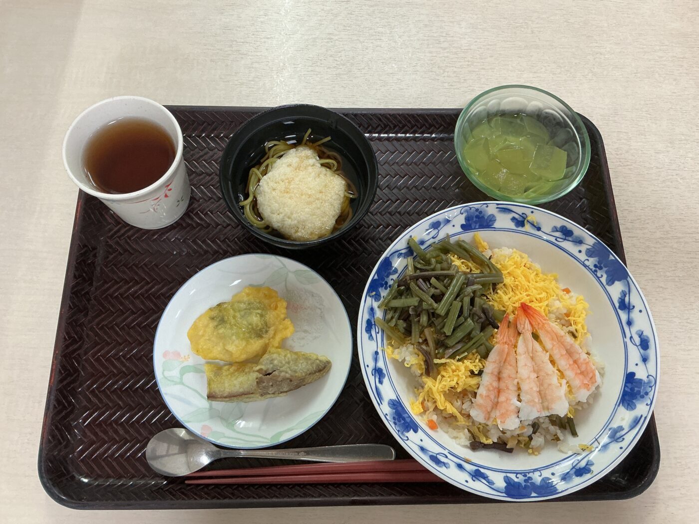こんにちは!管理栄養士です!8月11日は「山の日」です!当施設でも皆様に山の恵みを感じていただけるよう、「山の日特別献立」をご用意いたしました。 ~おしながき~ ●山菜ちらし寿司 ●鶏肉の梅しそ天ぷら ●ミニ茶そば ●はちみつレモンゼリー 山の...