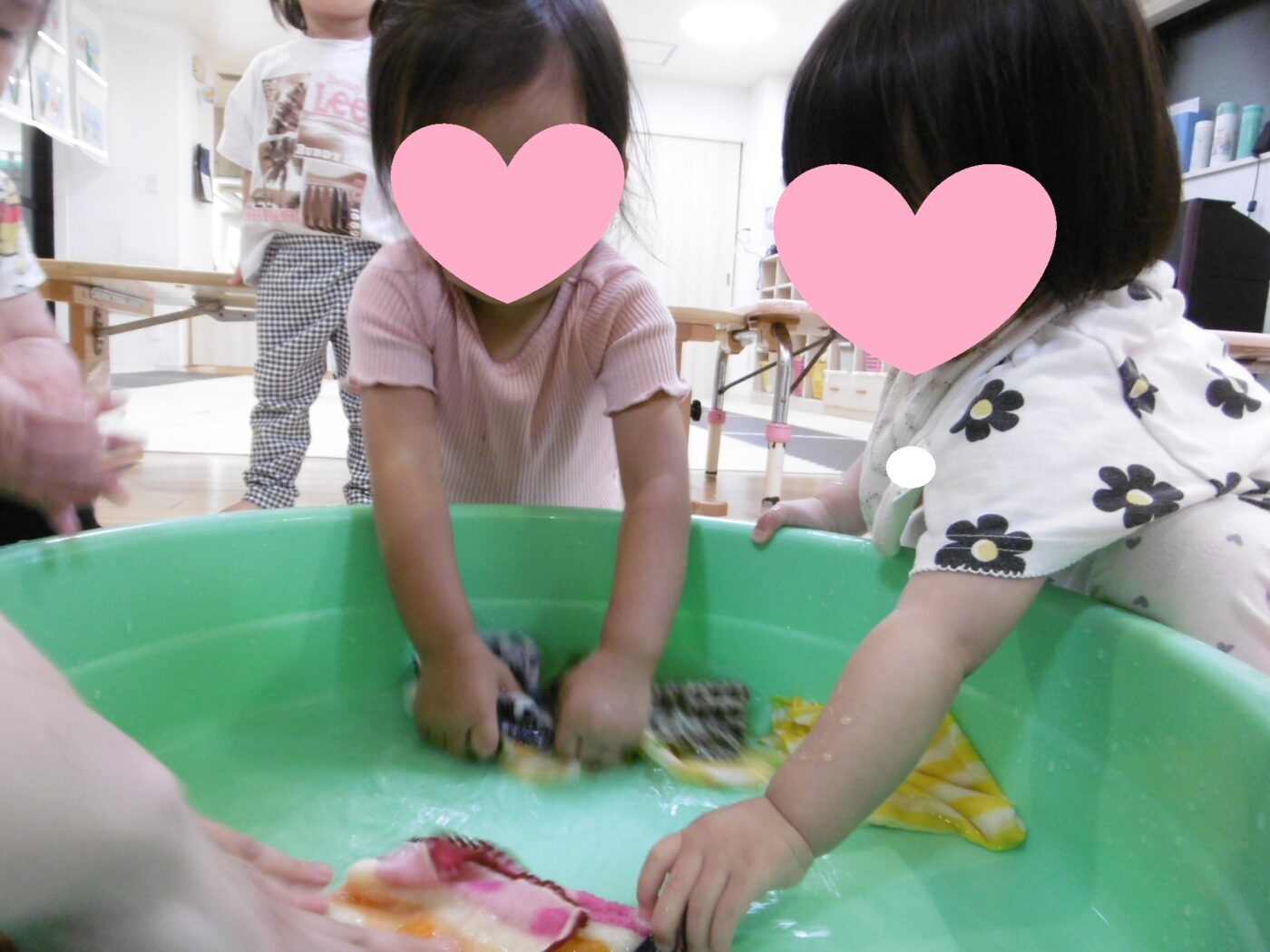 先生とやり取り遊びが楽しめるようになってきた つきぐみ(1歳児)の子どもたち。 お洗濯ごっこ。お水の入った、たらいの中でタオルをゴシゴシお洗濯。 きれいになったかな? 洗濯バサミではさんで干します。 お買い物ごっこ。「くださ~い!」と、お店... -
