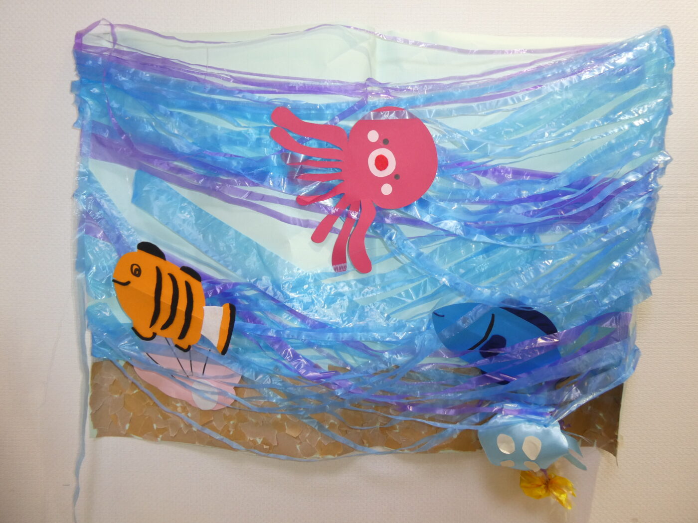 大阪府立清水谷高校3年生の学生が、家庭科の授業の一環で作成した 壁面を持参してくれて、子どもたちと一緒に遊んで交流しました。 ほしぐみ(0歳児)の子どもたちは、お姉ちゃんが作ってくれた 海のお魚に興味津々です。その後は、触れ合ったりおもちゃ... -