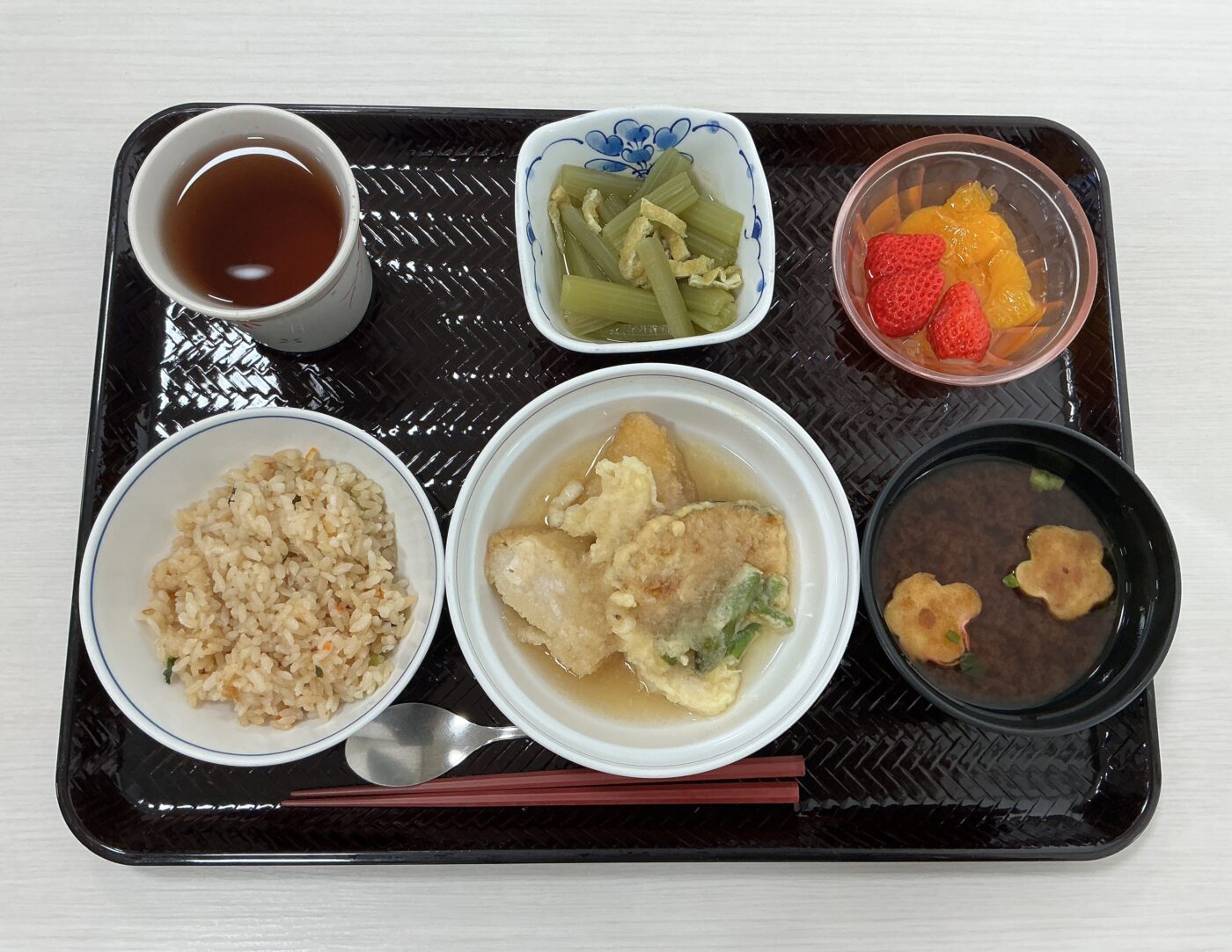 ●五目ご飯 ●鶏天と季節の天ぷら ●ふきの煮物 ●赤だし ●フルーツ(イチゴ、みかん缶)