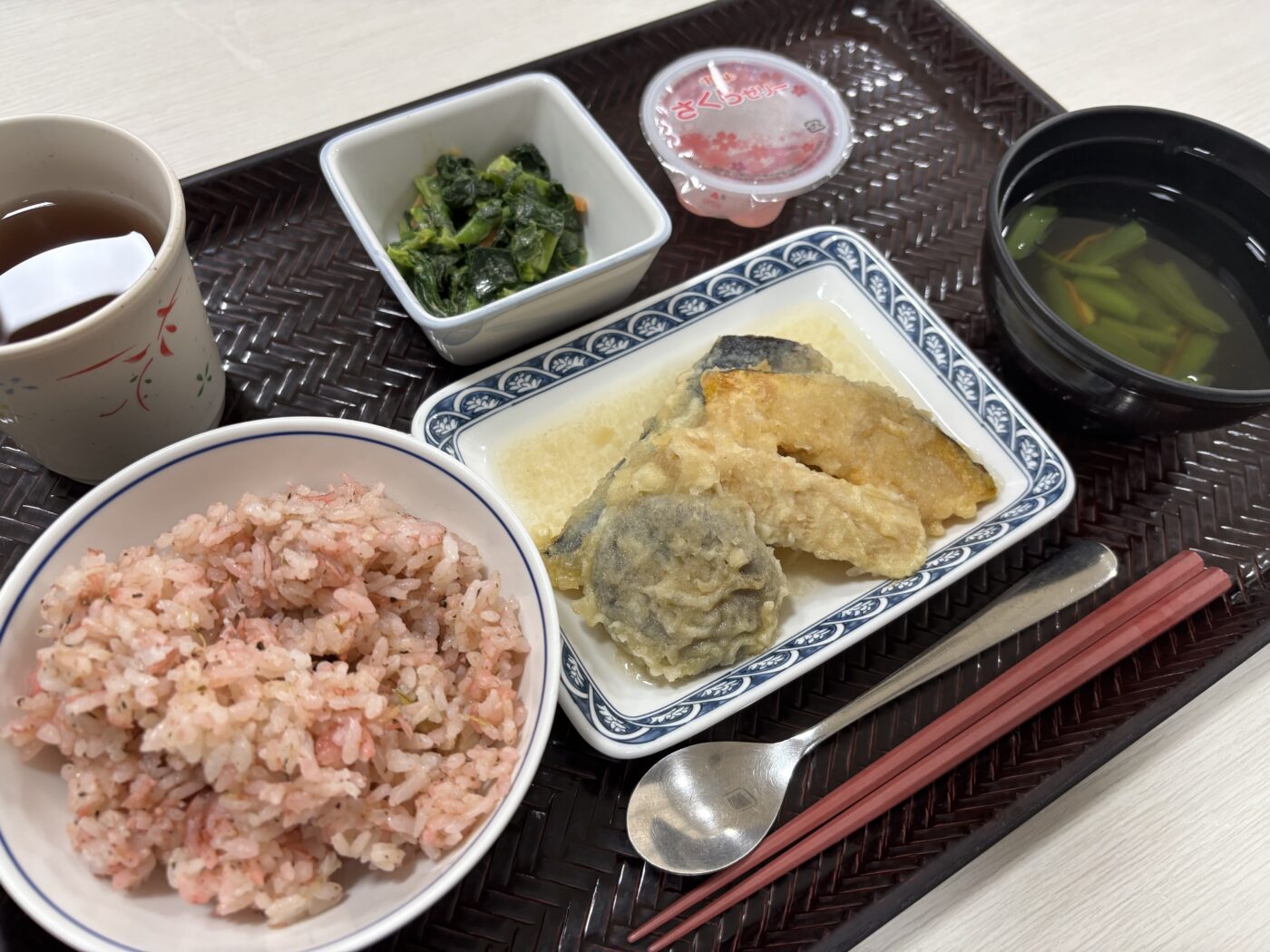 ★しらすと梅の混ぜご飯 ★季節の天ぷら ★菜の花の胡麻和え ★いんげんの清汁 ★桜ゼリー