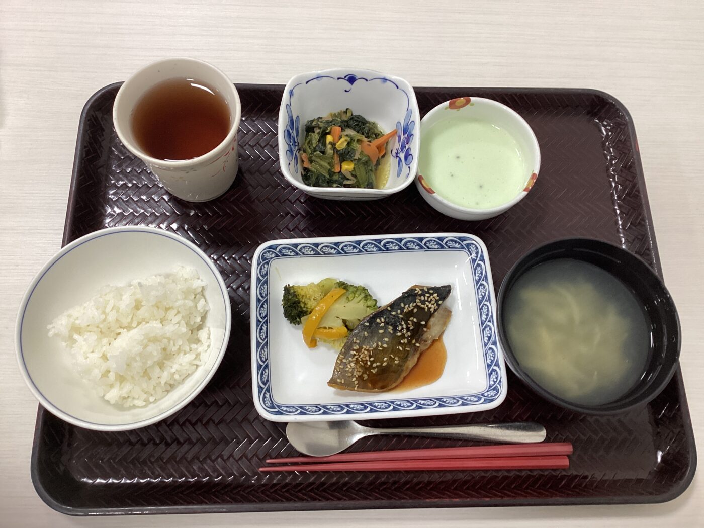 ●ご飯 ●鯵の胡麻衣焼き ●ほうれん草のハムソテー ●玉ねぎと葛のとろとろスープ