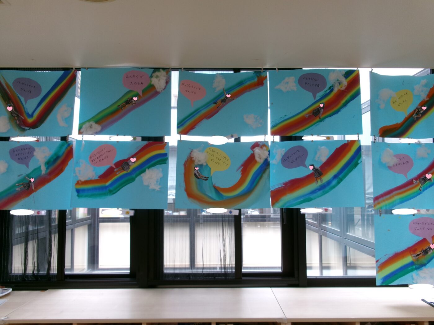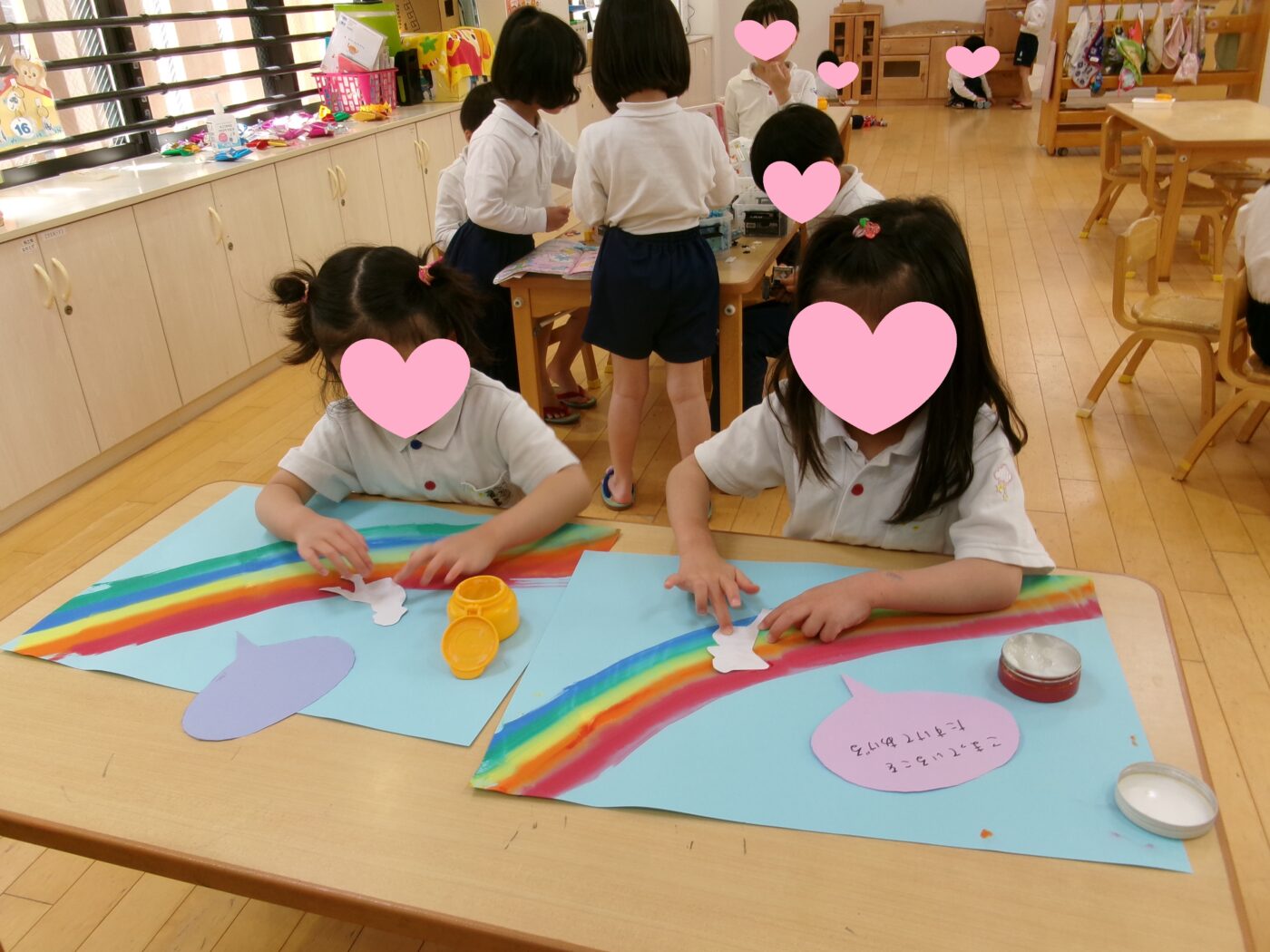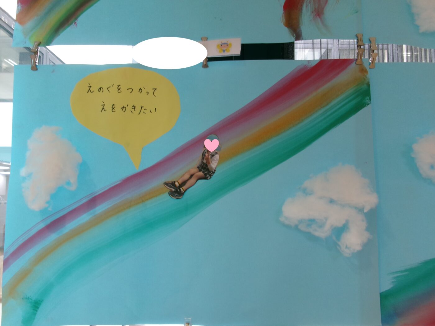絵の具を使って🌈にじの絵を描き、にじのスベリ台に自分の写真を貼り付けてかわいい