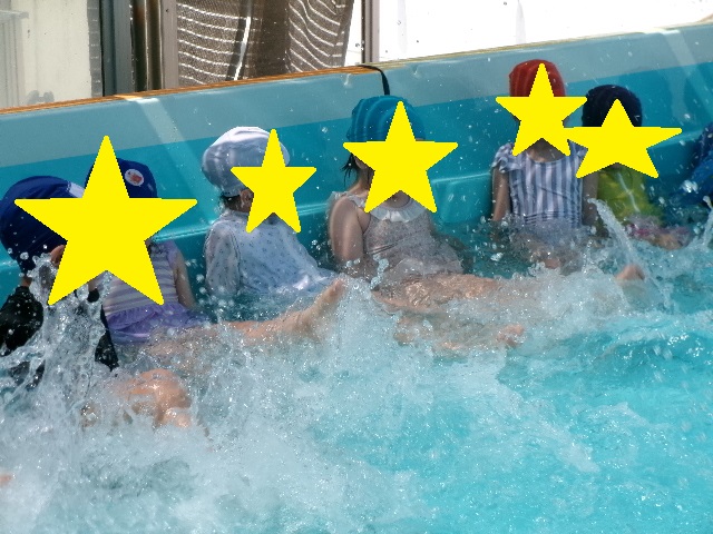 にじぐみ(5歳児)の子どもたちがプールに入り気持ちよさそうに