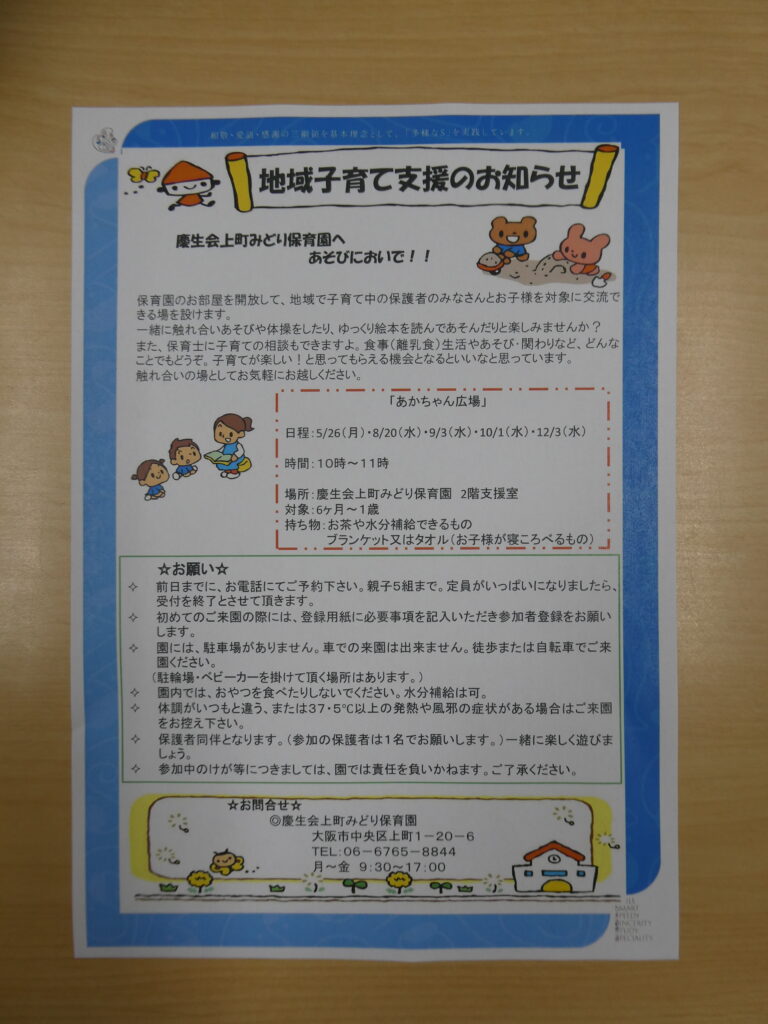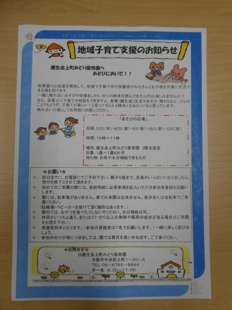 「子育て支援」 2025 5/12 スタッフブログ 慶生会上町みどり保育園 2025年5月12日令和7年度も「あそびの広場」「赤ちゃん広場」を始めます!!「あそびの広場」は、1歳~1歳6か月のお友だち「赤ちゃん広場」は、6か月~1歳のお友だち上町みどり保育園で一緒に遊びませんか?ふれあい遊びや体を動かしての遊びなど親子で楽しんで過ごしてもらえるような遊びを予定しています。お電話でのご予約をお待ちしています。 スタッフブログ 慶生会上町みどり保育園