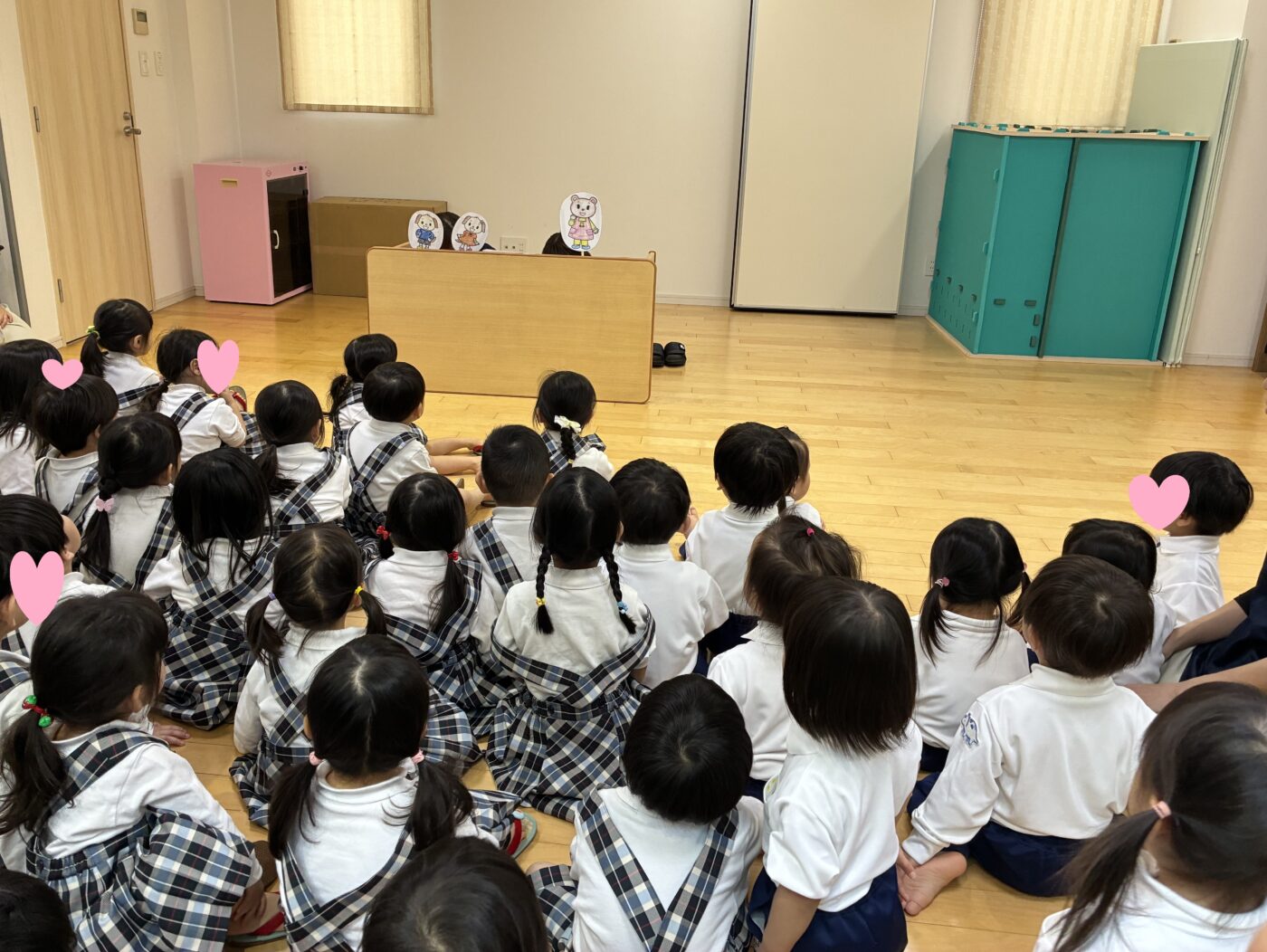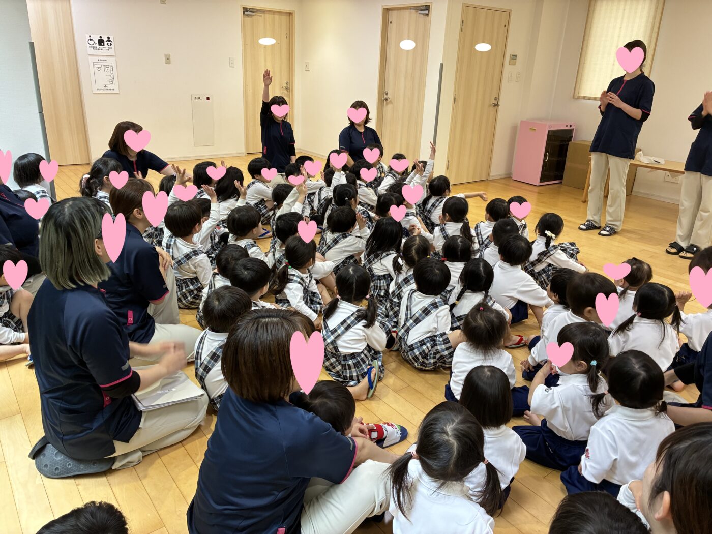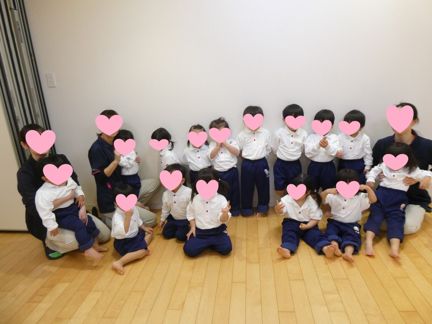 新しい体操服、制服を着て喜んでいるゆきぐみ(2歳児)はなぐみ(3歳児)の子どもたち。