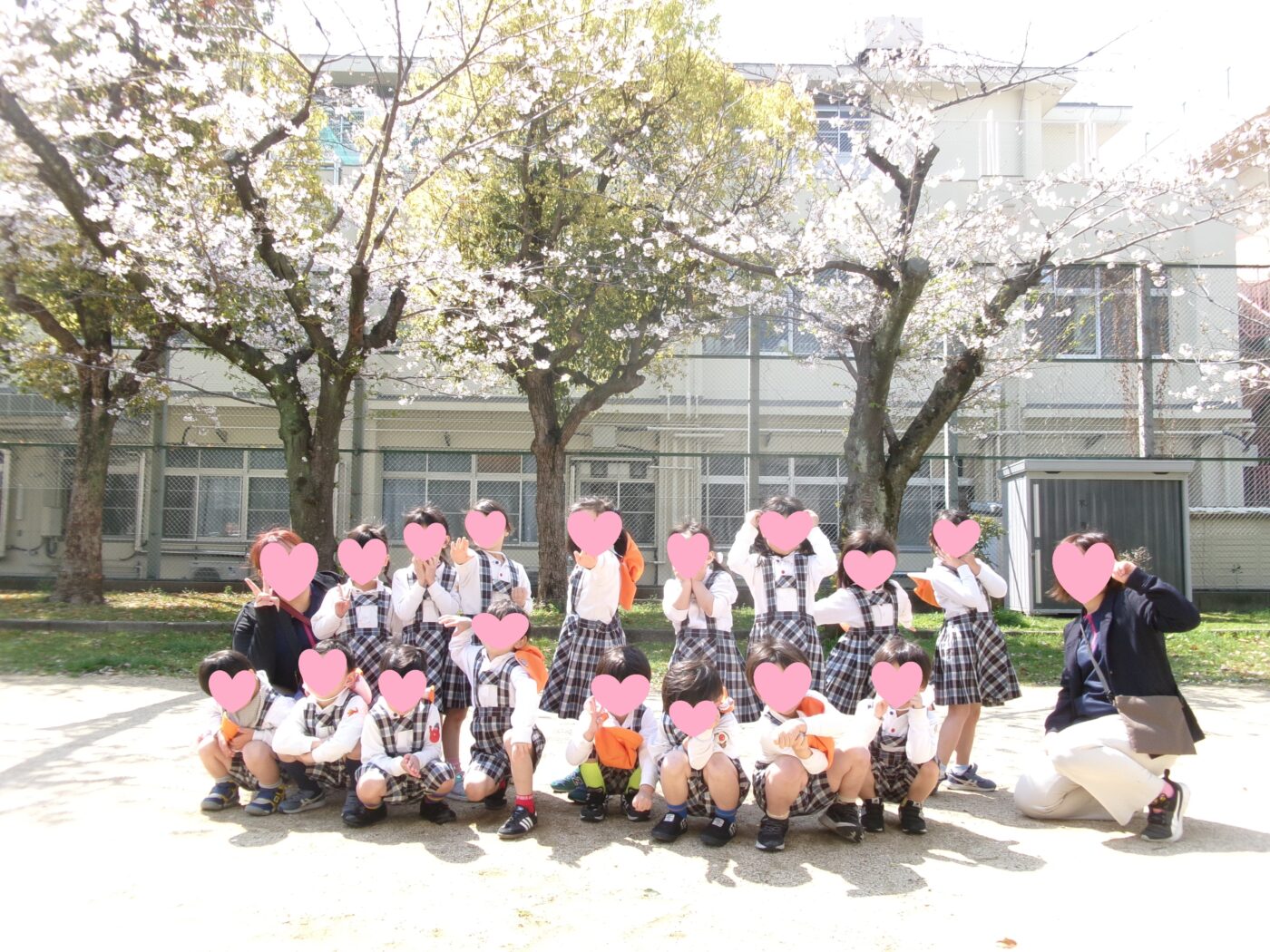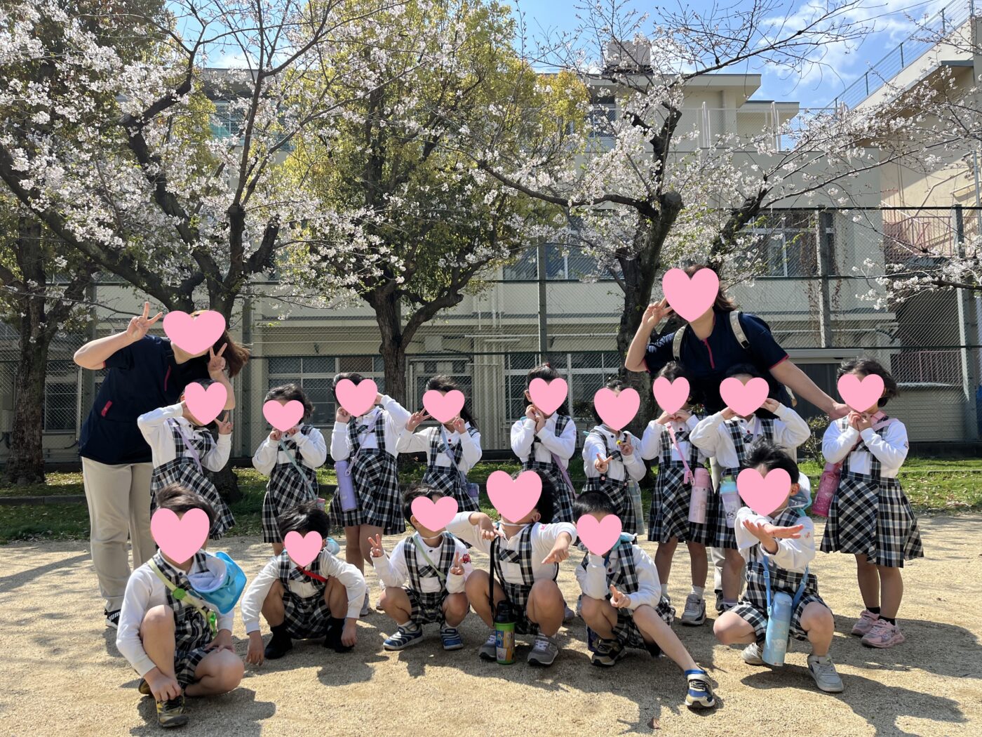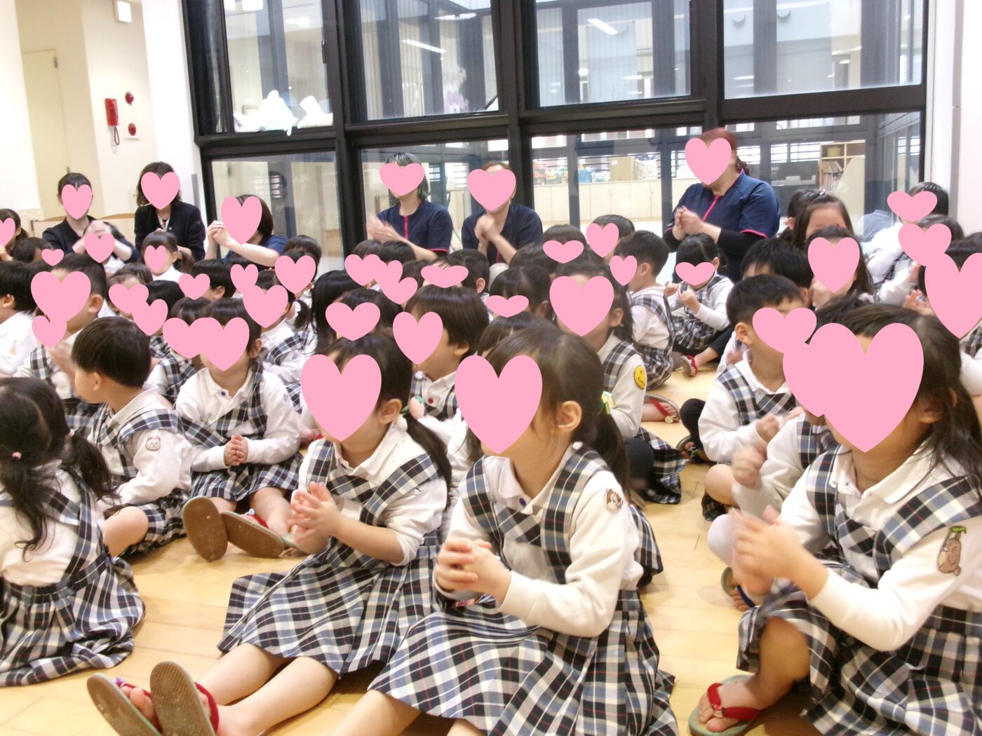 新しい体操服、制服を着て喜んでいるゆきぐみ(2歳児)はなぐみ(3歳児)の子どもたち。