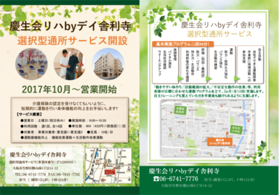 時下ますますご清栄のこととお慶び申し上げます。 このたび、大阪市生野区・東成区にて大阪市介護予防・日常生活支援総合事業の 一つである選択型通所サービスを平成29年10月より開設することになりました。 選択型通所サービスは、少し体が動きにく... -